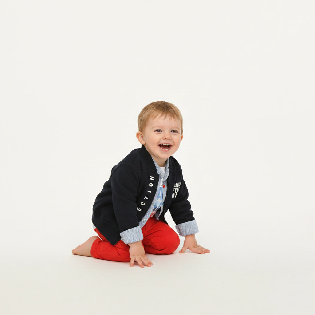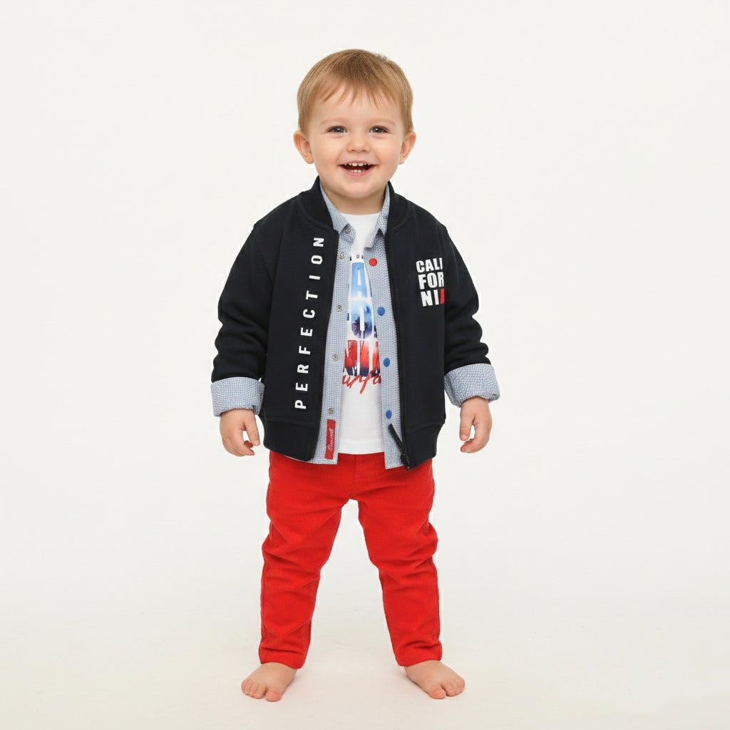 • Make a statement with this vibrant 3-piece set that blends sporty vibes with everyday comfort. Featuring the striking contrast of navy and bold red, this outfit is designed for the little one who’s always on the move.