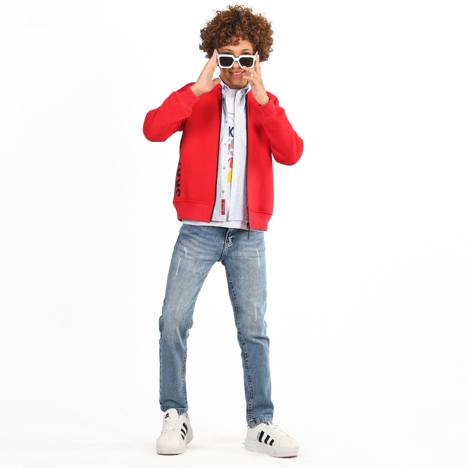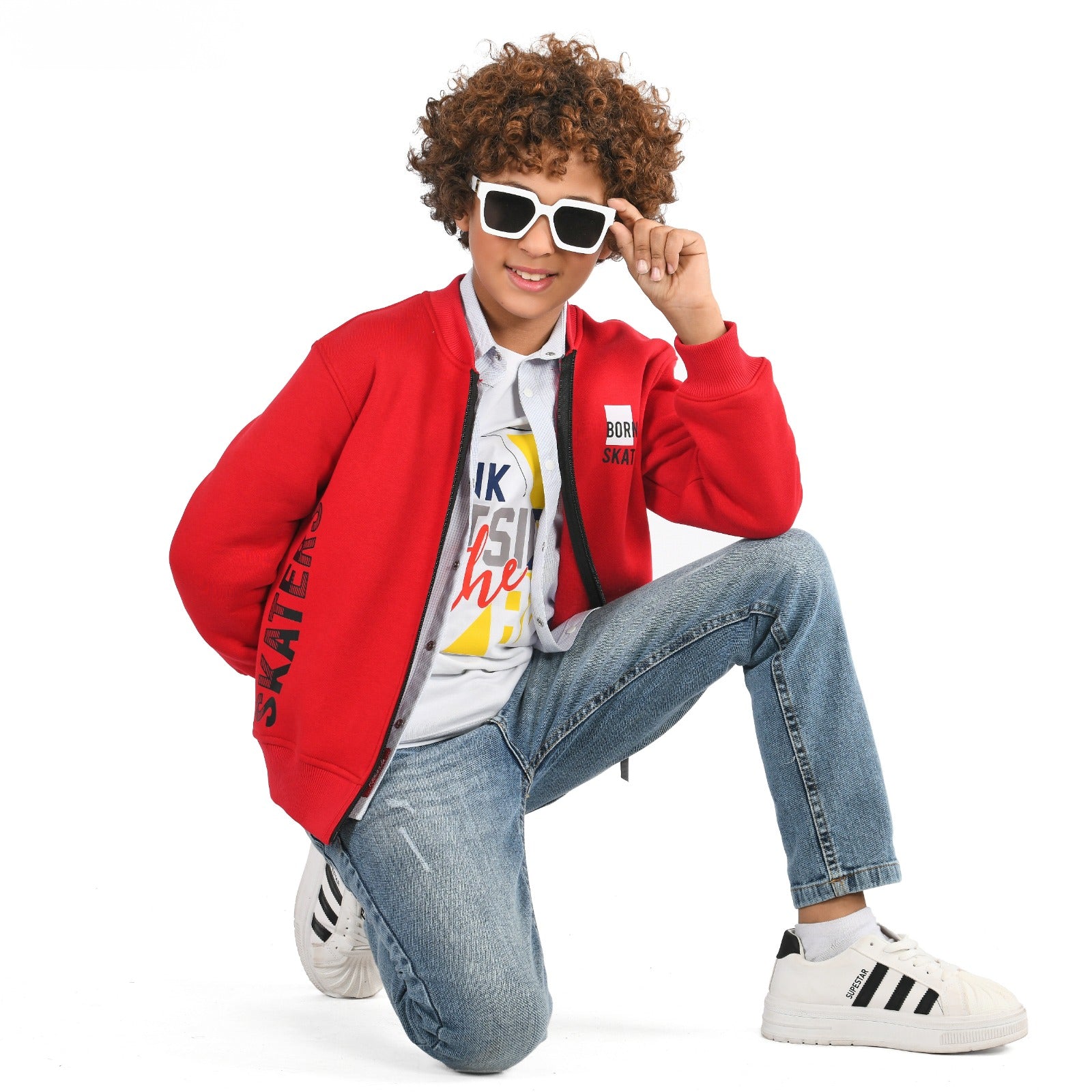 • A complete, ready-to-wear outfit featuring a bold red jacket, graphic tee, and stylish denim.