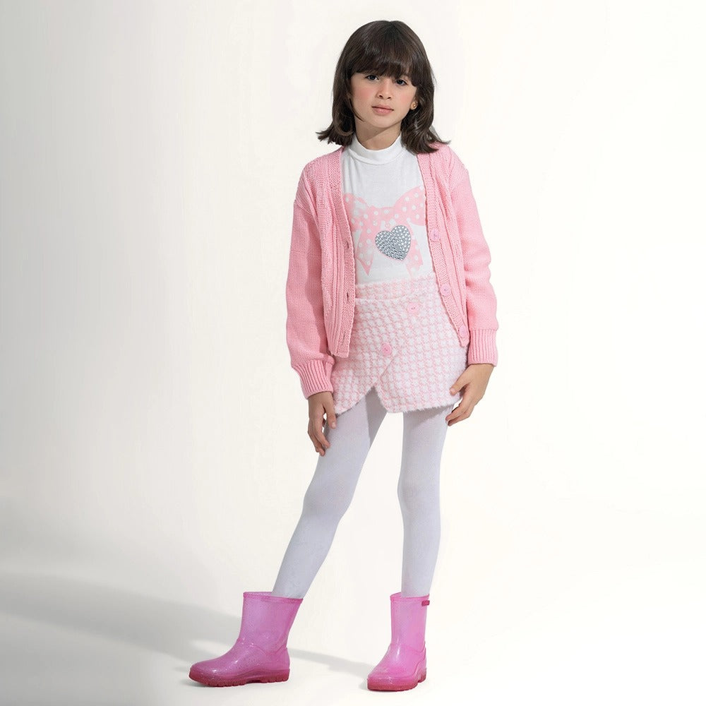 • A crisp white mock-neck top accented with a playful bow-and-heart graphic. The heart features shimmering stud detailing for an extra touch of sparkle.